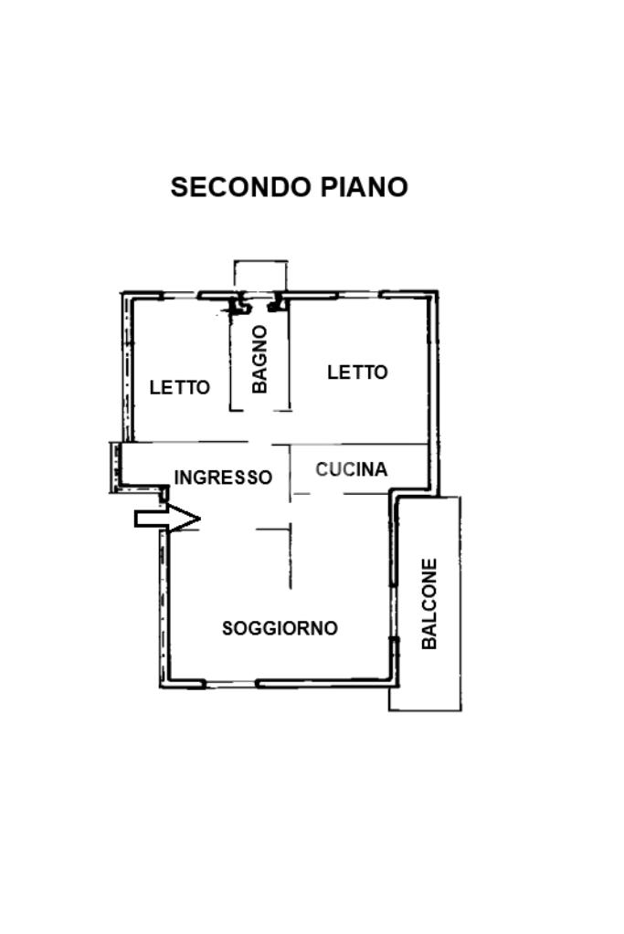 Ingresso, soggiorno con sala da pranzo in affaccio sul terrazzino e cucinotto. Due camere da letto matrimoniali e bagno finestrato con vasca in affaccio sul secondo balcone.