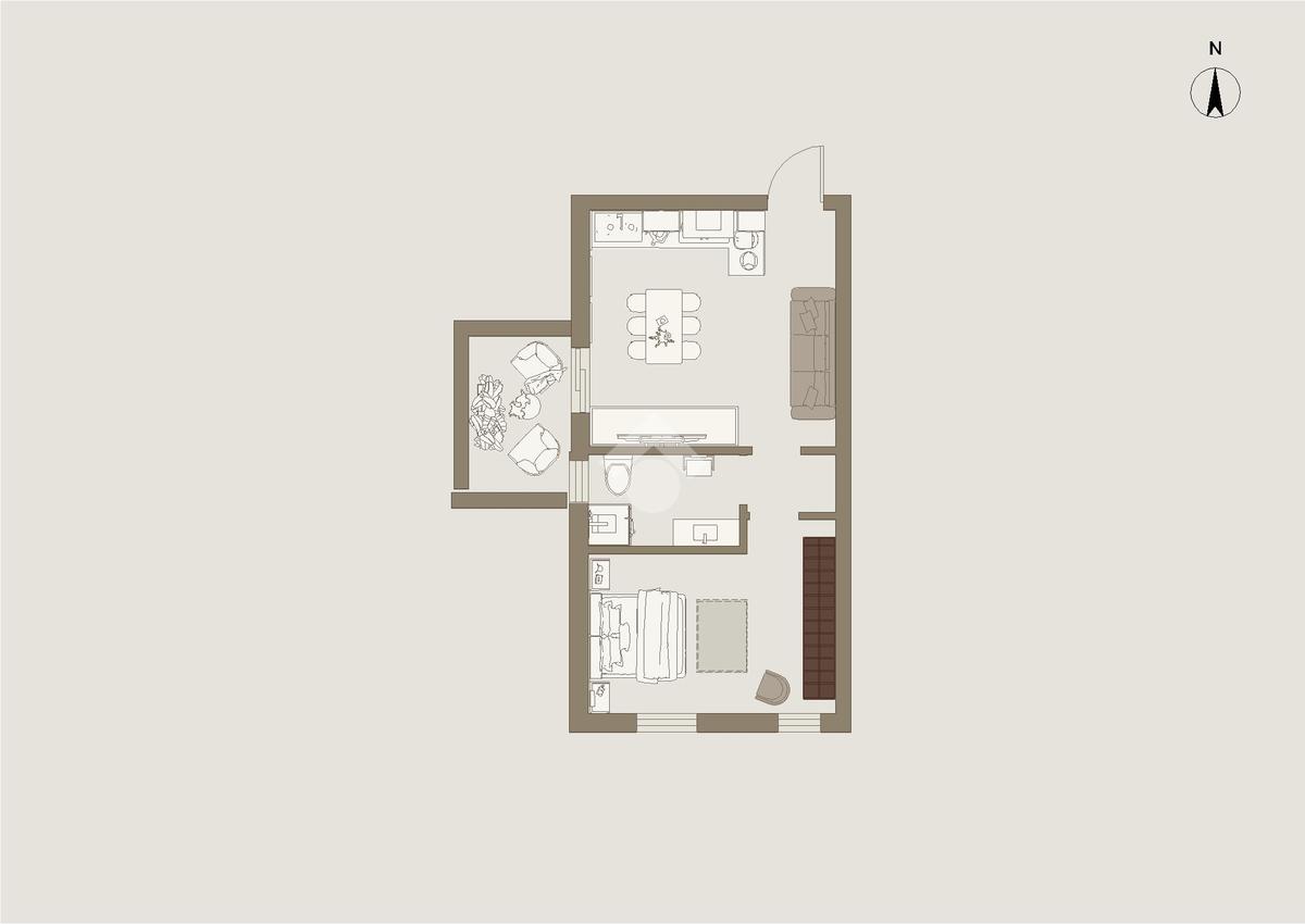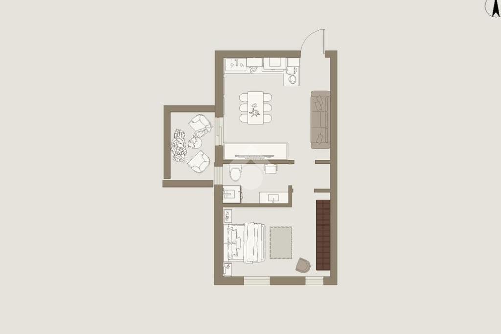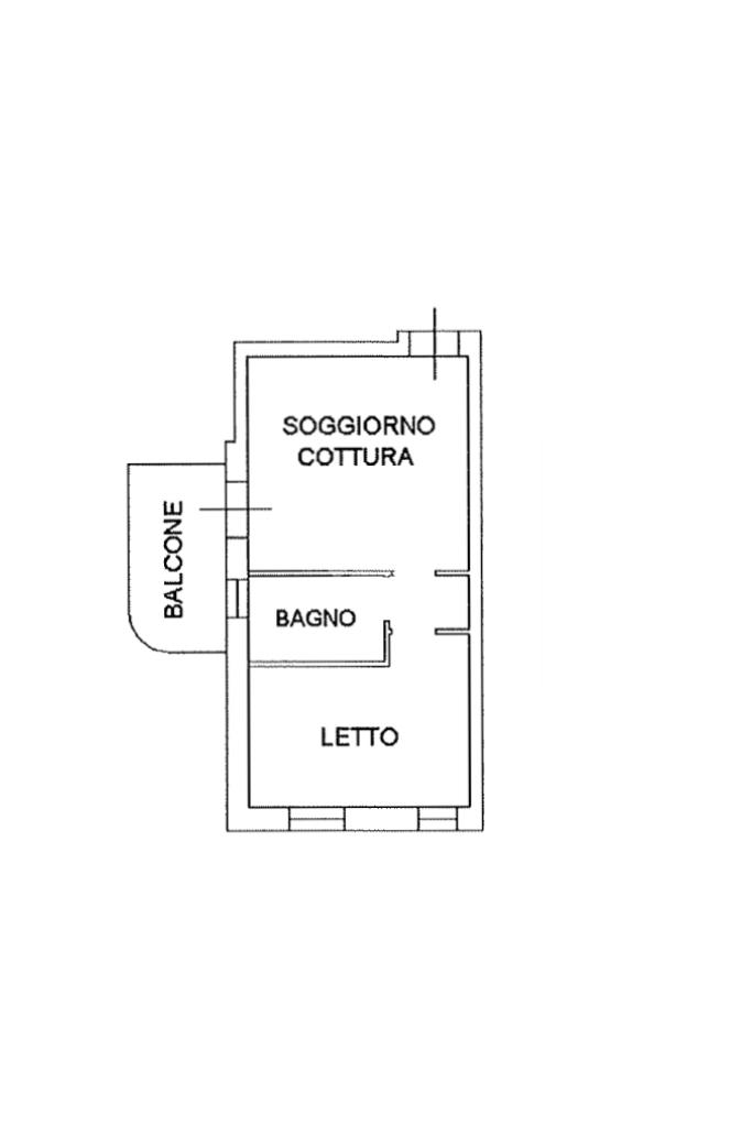 Ingresso sul soggiorno openspace con cucina in affaccio sul terrazzino, camera da letto matrimoniale, bagno finestrato con vasca.
