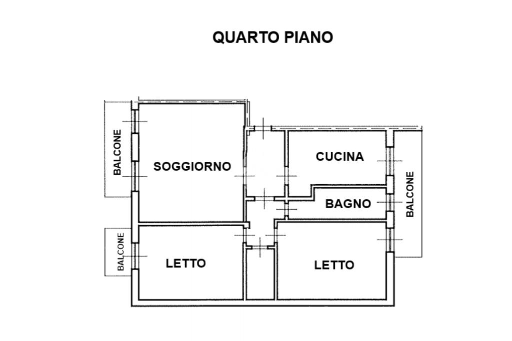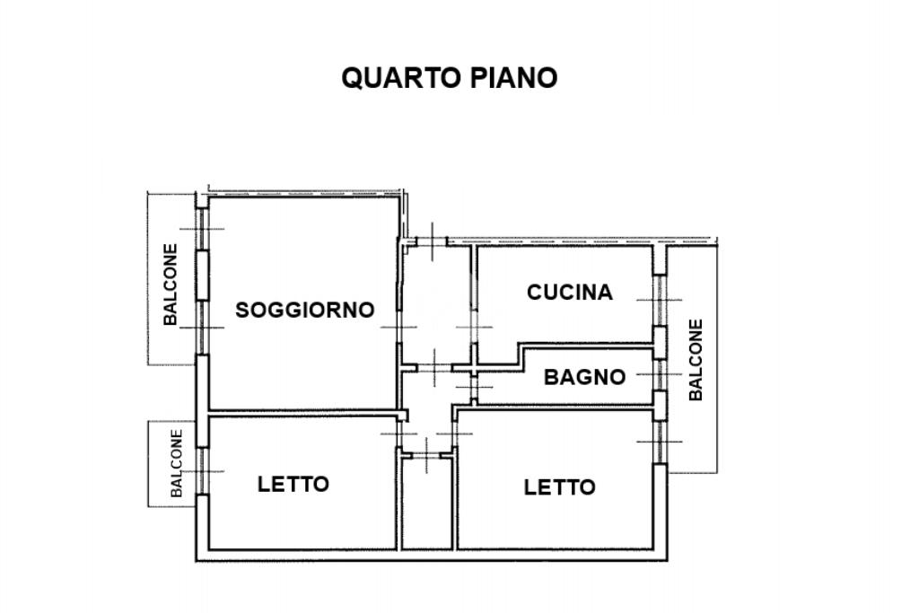 Ingresso, soggiorno in affaccio sul balcone, cucina abitabile in affaccio sul secondo balcone, due camere da letto matrimoniali entrambe in affaccio sul balcone, bagno finestrato con vasca e comodo ripostiglio.