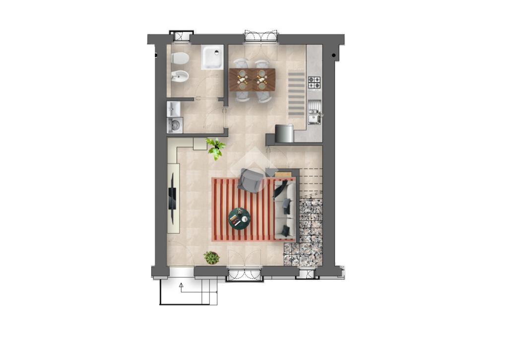 Ingresso sulla zona giorno composta da soggiorno, cucina da cui si può accedere al giardino, bagno con doccia, lavanderia e comodo ripostiglio.