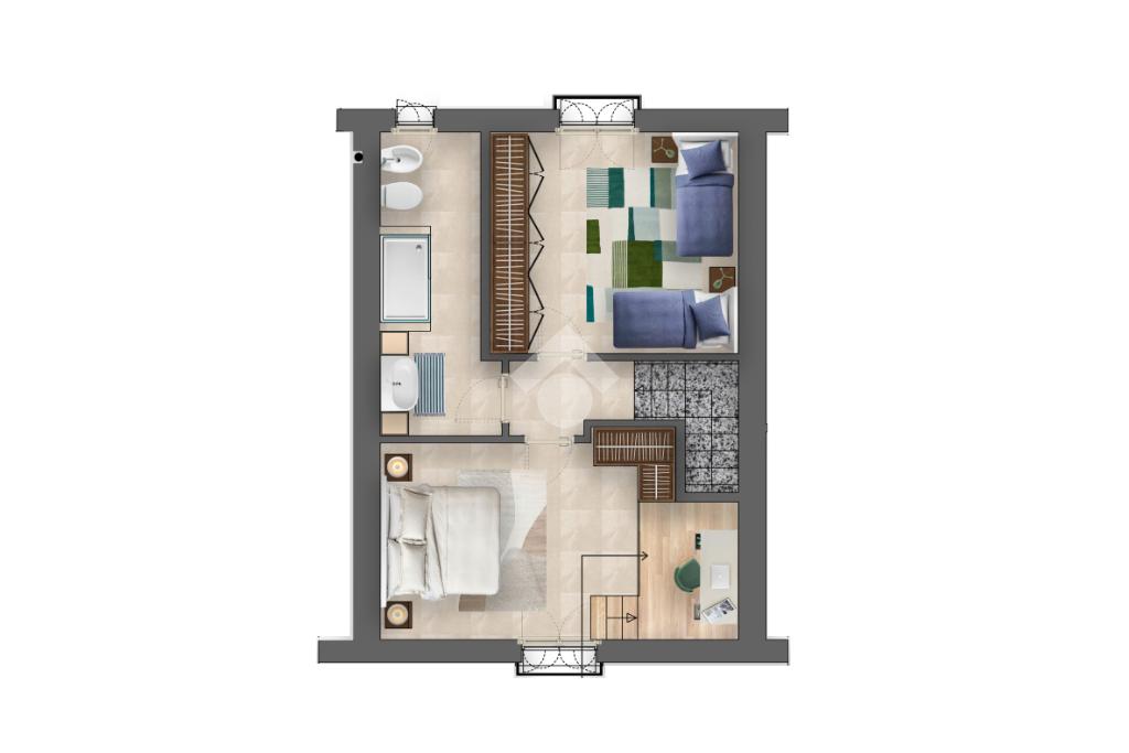 Al piano superiore una camera da letto matrimoniale, una camera da letto doppia ed il bagno.